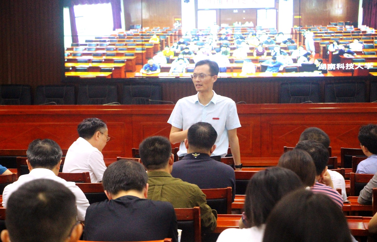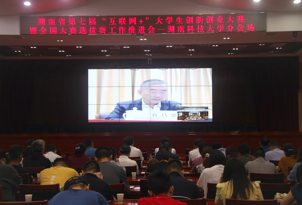 为贯彻落实党中央、国务院“大众创业,万众创新”重大决策部署,全面总结第六届“互联网+”大学生创新创业大赛工作经验,动员部署“建行杯”第七届湖南省“互联网+”大学生创新创业大赛。5月13日上午,湖南省第七届“互联网+”大学生创新创业大赛暨全国大赛选拔赛工作推进会召开。我校在立德楼A附楼五楼报告厅举办视频分会场,副校长廖湘岳出席会议,我校“互联网+”大赛工作领导小组组长及相关成员与会。