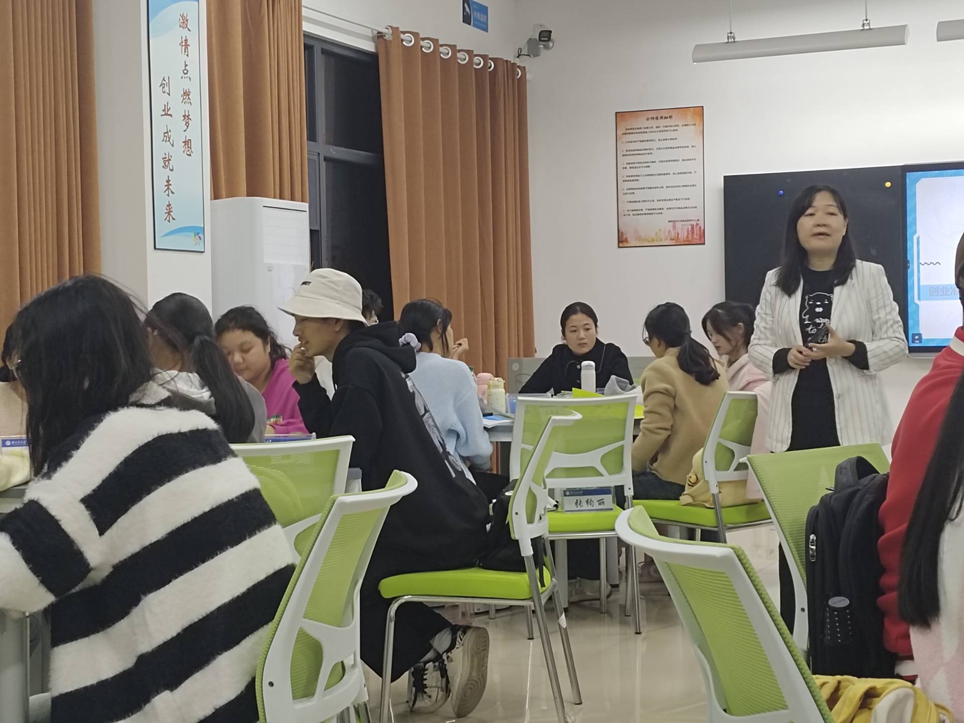 胡老师对同学们寄予厚望,希望大家在培训课程中积极学习、勇于实践,将所学知识转化为实际行动。她鼓励同学们通过小组讨论,构思自己的创业计划,并勇敢地上台分享,张绚丽同学阐述了自己的创业构想,展现了立足实践、明确方向的决心,她的信念和努力让我们有理由相信,她的创业梦想终将成为现实。
