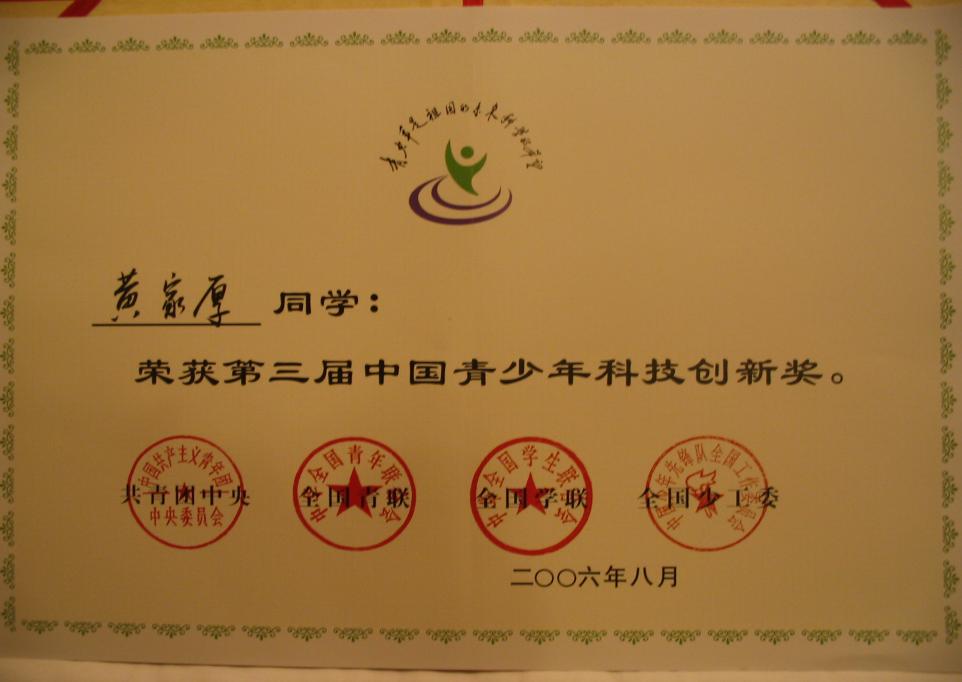 学生黄家厚获第三届中国青少年科技创新奖