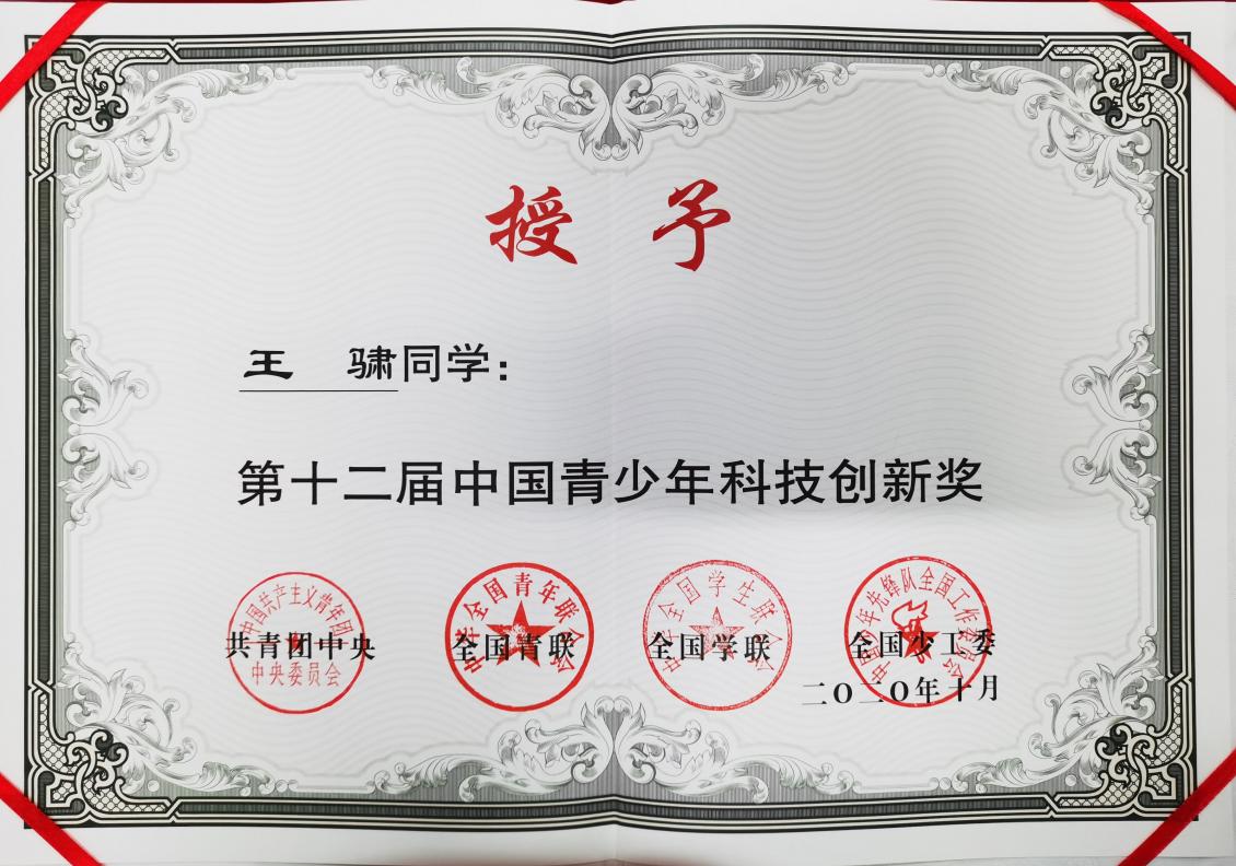 学生王骕获第十二届中国青少年科技创新奖